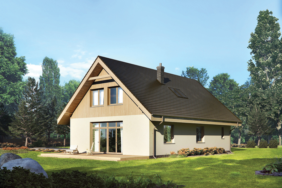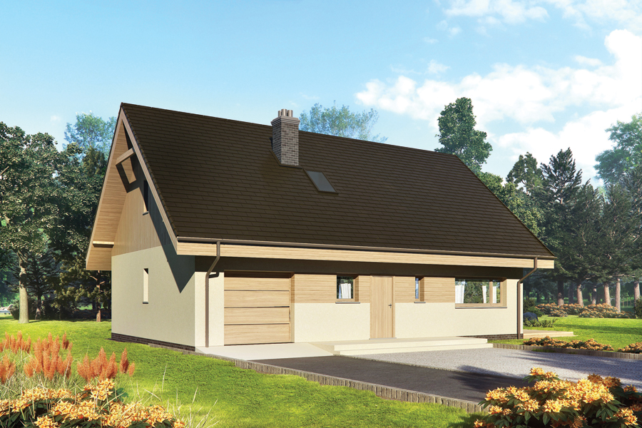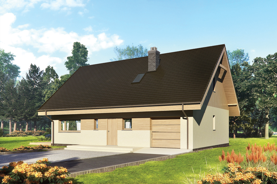 Projekt domu na planie prostokąta, przykryty dwuspadowym dachem sprzyja oszczędnościom na etapie budowy a później na etapie eksploatacji. Dodatkowe ocieplenia ścian, stropu, dachu, podłogi na gruncie za sprawą kwalifikacji do domu z wentylacją mechaniczną, przyniosą oszczędności na ogrzewaniu. Skromna elewacja w ciepłym beżowo-czekoladowym kolorze pozwoli wtopić się bryle w każde otoczenie. Dom ma wszystko, czego potrzebuje do wygodnego życia pięcioosobowa rodzina. Otwarta na salon kuchnia stanowi wraz z nim ponad połowę powierzchni parteru. Tu będzie toczyło się życie rodzinne. Zaciszny dodatkowy pokój będzie dobrym azylem dla dorastającego dziecka lub starszego członka rodziny. Resztę parteru uzupełnia strefa sanitarno-gospodarcza z jednostanowiskowym garażem. Wygodnie usytuowana klatka schodowa zaprasza na górę do królestwa trzech sypialni. Autor przewidział tam jeszcze pomieszczenie do indywidualnej adaptacji np. na dodatkowy pokój, kino domowe czy pracownię.
