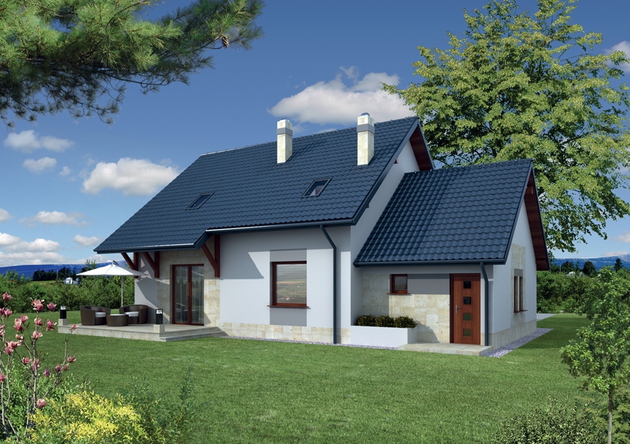 Doskonały projekt domu z poddaszem użytkowym dla cztero, - pięcioosobowej rodziny. Większą część parteru zajmuje część dzienna, wspólna dla wszystkich domowników. Kuchnia z widokiem na strefę wejścia, płynnie łączy sie z jadalnią. Ona z kolei z pokojem dziennym. W salonie, przy kominku, toczyć się będą niekończące się rozmowy. W pogodne dni domownicy i goście chętnie korzystać będą z częściowo zadaszonego tarasu. Z niego już tylko jedne krok do ogrodu i bliskiego kontaktu z naturą. Na poziomie parteru na uwagę zasługuje także pokój w zacisznej części domu. Może to być doskonałe miejsce dla nastolatka lub seniora rodu. Jednostanowiskowy garaż wraz z przylegającą do niego kotłownią autor zaproponował w bocznej części domu, odległej o strefy dziennej. Kolorowe sny mieszkańcy