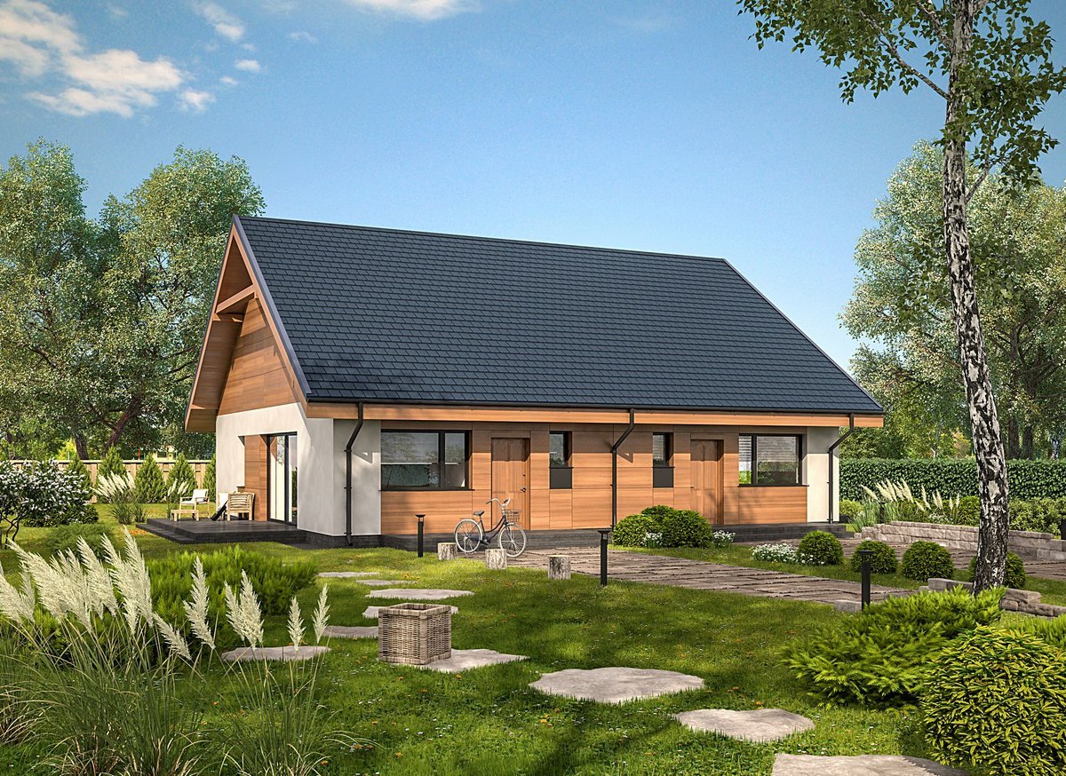 Zgrabny bliźniak o bardzo prostej bryle, który z pewnością będzie tani w budowie i eksploatacji. Charakteryzuje go bardzo ładny dobór materiałów wykończeniowych
