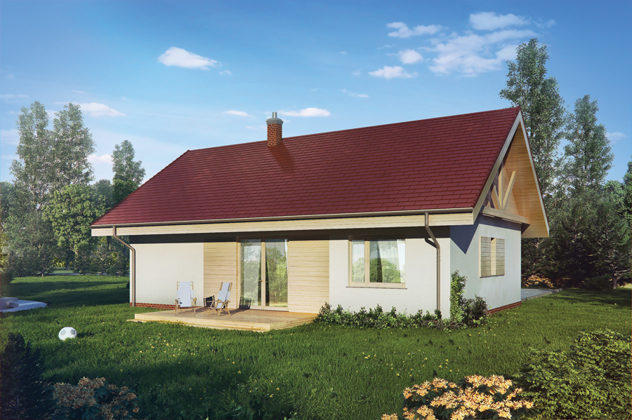 Projekt parterowego domu, który w każdej chwili powierzchnię niespełna 80 mkw. może zwiększyć o kolejne ponad 40 mkw. powierzchni. Autor projektu przewidział, że domownicy wraz z rozwojem rodziny zechcą powiększyć przestrzeń swojego domu. W ich gestii pozostaje tylko, kiedy i jak będzie wyglądało poddasze. Na samym parterze może zamieszkać wygodnie, co najmniej czteroosobowa rodzina. Centralną część kondygnacji stanowi strefa dzienna. Salon, jadalnia, kuchnia przenikają się wzajemnie i tworzą wspólną otwartą przestrzeń. Naturalnym przedłużeniem tej strefy jest taras, na który zapraszają podwójne drzwi balkonowe. Warto pomyśleć o parasolach chroniących przed słońcem i wygodnych fotelach ogrodowych. Trzy sypialnie w bocznych nawach, otulają centrum domu. Sypialnia małżeńska, tuż przy wejściu, ma do dyspozycji sąsiadującą z nią łazienkę, użytkownicy sypialni po przeciwnej stronie dzielić się będą jedna wspólną łazienką.