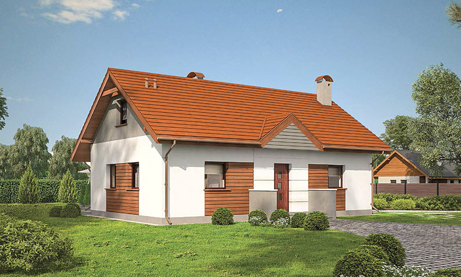 Pod tęczą - wariant III nieduży (63,4 mkw.), tani w budowie dom dla młodego małżeństwa lub seniorów. W razie potrzeby inwestorzy mogą również zaadaptować blisko 35 mkw. powierzchni na poddaszu. Dom ma klasyczną budowę na planie prostokąta i jest przekryty klasycznym, dwuspadowym dachem. Fragmenty elewacji zostały wykończone drewnem, które znakomicie harmonizuje z również klasyczną, czerwoną dachówką. Wejście podkreśla niewielki daszek a elewację wokół drzwi dodatkowo ozdabiają bonie. Całość, mimo tylu tradycyjnych elementów ma jednak dużą dozę nowoczesności. Wnętrze domu kryje wygodną przestrzeń niezbędną do życia dla dwóch osób. Tuż przy wejściu w niewielkim przedsionku jest miejsce na szafę wnękową. Parter podzielono na dwie części. Lewa strona to otwarty pokój dzienny z aneksem kuchennym oraz miejscem na stół jadalniany. W części prawej znajdują się duża, widna sypialnia małżeńska, łazienka oraz kotłownia. Obie strefy domu są oddzielone drzwiami, aby zapewnić domownikom jak najwięcej prywatności, ale wedle uznania można z nich zrezygnować i otworzyć strefę dzienną na resztę domu.