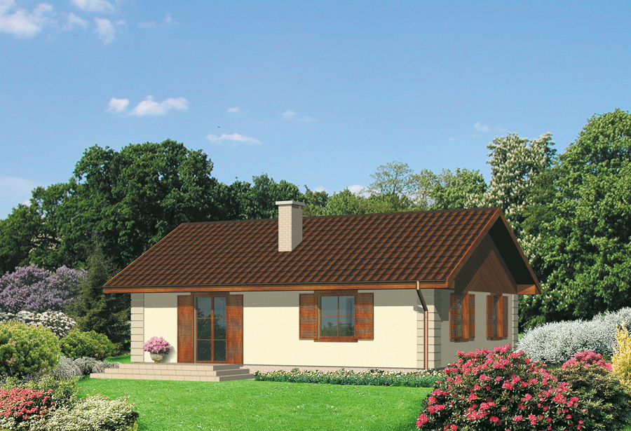 Projekt domu Roztropny - Murator C88 niewielki, urokliwy, przytulny dom dla trzyosobowej rodziny lub starszego małżeństwa. Może być także wygodnym domem letnim. Prosta bryła budynku, z centralnie umieszczonym gankiem wejściowym, nawiązuje do tradycyjnej architektury dworkowej. Styl ten podkreślają zwłaszcza kolumny akcentujące zadaszone wejście, boniowane narożniki i cokół oraz okiennice w naturalnym kolorze drewna. Wnętrze tego niewielkiego domu zaprojektowano bardzo wygodnie i funkcjonalnie. Przestrzeń zorganizowano wokół centralnego holu, z którego można wejść do wszystkich pozostałych pomieszczeń: otwartej kuchni z miejscem na rodzinny stół, salonu z kominkiem i wyjściem na taras, dwóch przestronnych i wygodnych sypialń, łazienki i dodatkowego wc. Mimo niewielkiej powierzchni domu, wszystkie pomieszczenia są dość duże i widne.