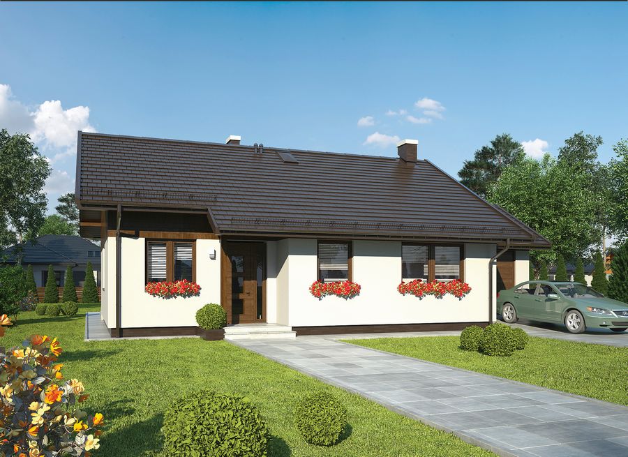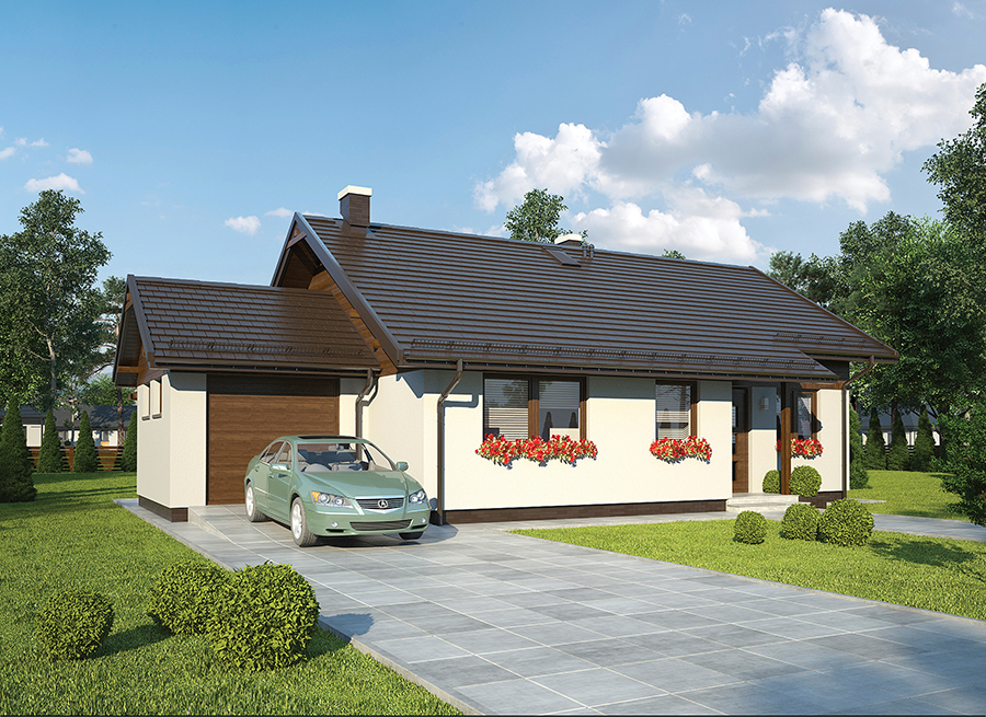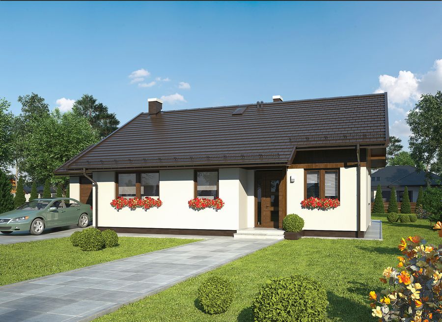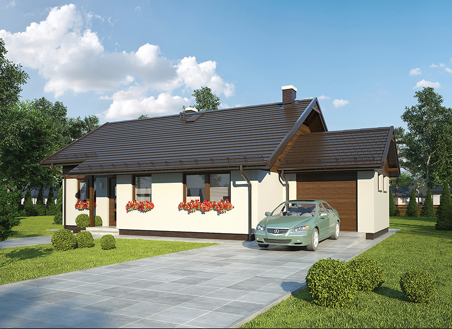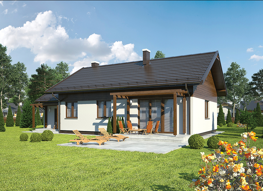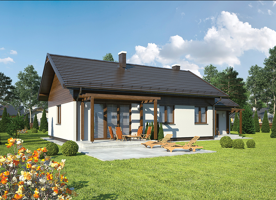 Niewielki, skromny dom z programem zaspokajającym potrzeby 4-osobowej rodziny. Nieskomplikowana bryła, dwuspadowy dach i zastosowane materiały sprawiają, że dom będzie tani w budowie i eksploatacji. Wnętrze kryje przestronny salon z jadalnią, w którym centralne miejsce zajmuje kominek - wprowadzi on przytulną atmosferę i umili zimowe wieczory. Salon jest połączony z otwartą kuchnią, dzięki czemu osoba przygotowująca posiłki ma kontakt z resztą domowników. Do dyspozycji gości jest niewielka toaleta tuż przy wejściu. Po prawej stronie od wejścia autor zaprojektował trzy wygodne sypialnie oraz większą łazienkę, w której zmieści się prysznic i wanna. W głębi domu jest też kotłownia na paliwo stałe, z której można przejść bezpośrednio do garażu. Dużym atutem domu są dwa tarasy usytuowane od ogrodu - na jeden wychodzi się z salonu, a na drugi - z garażu. Oba są przekryte malowniczą pergolą, która zapewni naturalną ochronę przed słońcem. W projekcie przewidziano możliwość wykorzystania dodatkowej powierzchni mieszkalnej na poddaszu, po dostosowaniu pomieszczeń do stałego pobytu osób (44,3 mkw. powierzchni użytkowej).