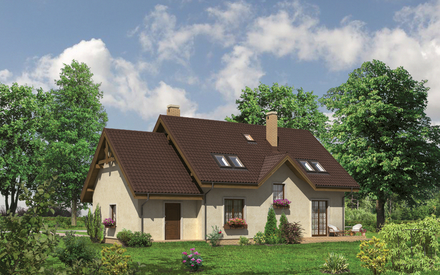 Ten prosty, zaprojektowany na rzucie prostokąta, dom zyskuje dzięki detalom i zróżnicowanym elewacjom. Frontową ubogaca ryzalit kuchni i znajdująca się nad nim lukarna z balkonem, boczne