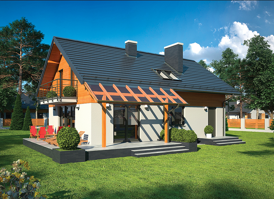 Nieduży, ale przestronny dom z poddaszem użytkowym dla 4-osobowej rodziny. Okładzina na elewacji o przyjemnej miodowej barwie sprawia, że będzie się ładnie prezentował w wiejskim lub podmiejskim krajobrazie. Wnętrze kryje czytelny i dobrze przemyślany układ pomieszczeń. Niemal połowę powierzchni parteru zajmuje obszerna, dobrze doświetlona strefa dzienna, w której można zjeść wspólny posiłek i odpocząć, podziwiając przyrodę za oknem. Jeśli pogoda na to pozwoli, posiłki można jadać na pięknym tarasie okalającym dom z dwóch stron. Malownicza pergola zapewni nam osłonę przed słońcem. Na chłodniejsze wieczory idealny będzie kominek stanowiący serce salonu. Dla wygody domowników autor zaprojektował kuchnię tuż obok jadalni, z kuchni z kolei przechodzi się do spiżarnia, a ze spiżarni do garażu - taki układ ułatwi wnoszenie i rozpakowywanie zakupów. Z garażu można też przejść do kotłowni, która ma osobne wejście od strony ogrodu. Na poddaszu znajdziemy piękny salon kąpielowy oraz trzy wygodne sypialnie. Jedna z nich ma osobną garderobę i wyjście na balkon, dlatego znakomicie nadaje się jako master bedroom.