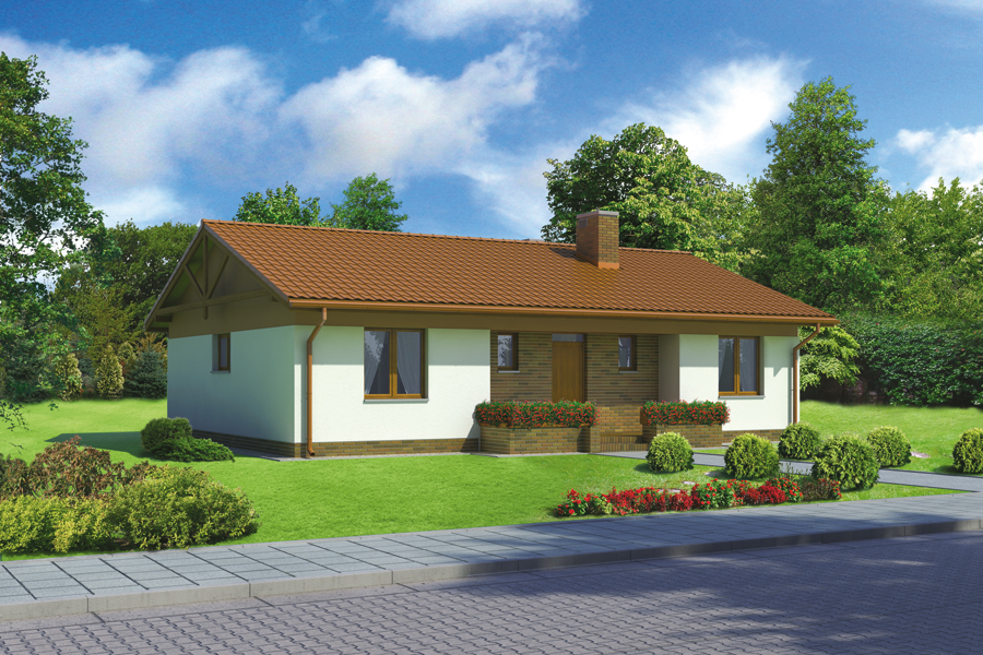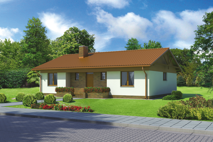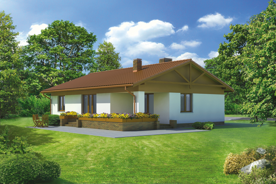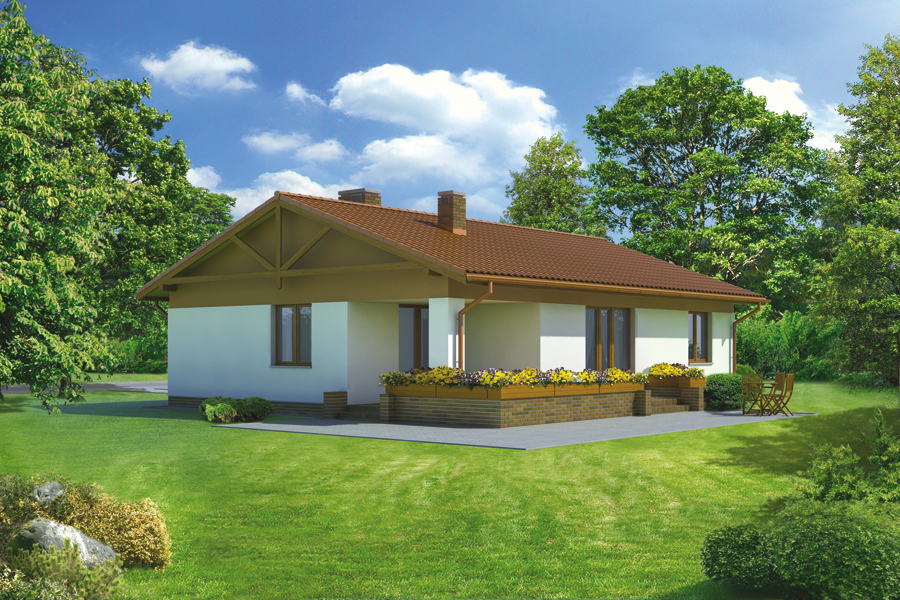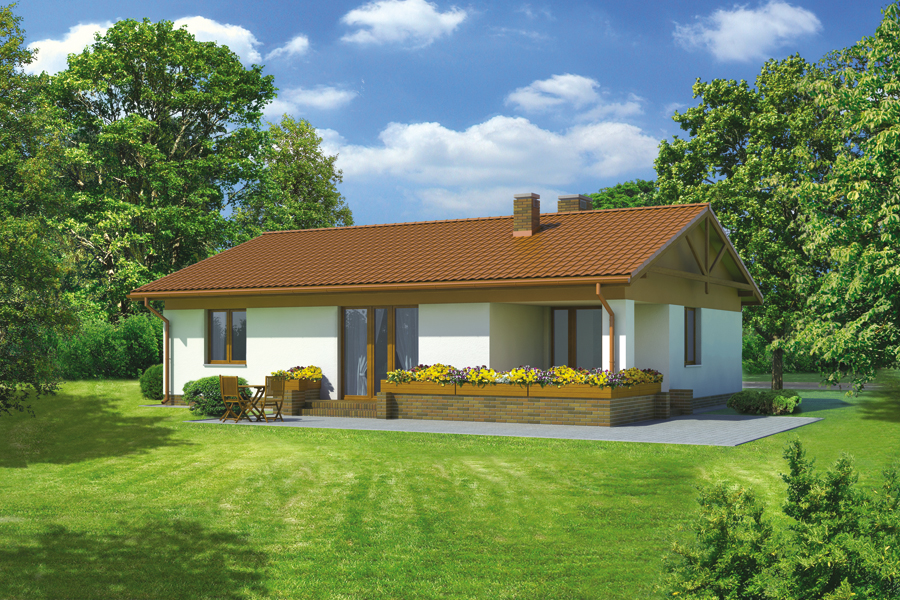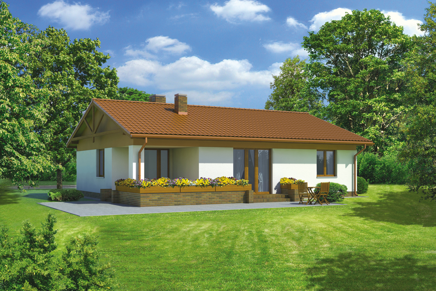 Idealna propozycja całorocznego domu dla pary seniorów, którzy nie lubią wspinać się po schodach i marzą o zacisznym i samodzielnym lokum, gdzie mogliby wygodnie mieszkać i cieszyć się kontaktem z przyrodą. Znakomicie sprawdzi się też jako dom letniskowy dla kilkuosobowej rodziny. Dom ma bardzo regularny kształt i jest przekryty dwuspadowym dachem, dzięki czemu jego budowa nie jest skomplikowana ani kosztowna. Projekt wyróżniają rozbudowane strefy pośrednie